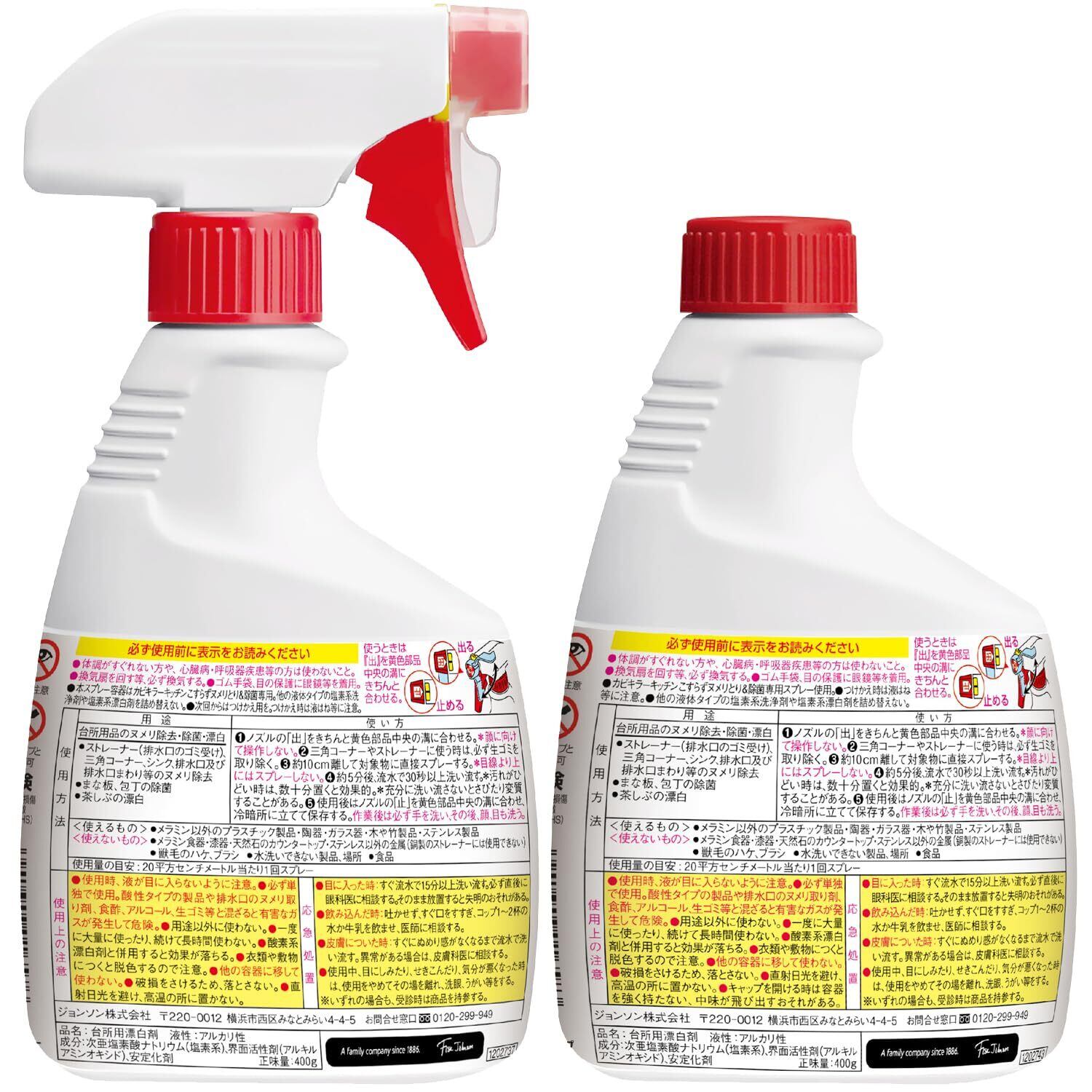 【カビキラー キッチンスプレー こすらずヌメリ取り&除菌 本体400g+詰め替え400g×2本の商品詳細】 ●ヌメリに触ることなく、こすり洗い不要 ●排水口のヌメリを除去 ●排水口カゴのヌメリに ●こすらずヌメリとり ●99.9%除菌* (*すべての菌にあてはまるわけではありません)(衛生微生物研究センター実施・ストレーナー、排水口まわり、シンク、まな板)