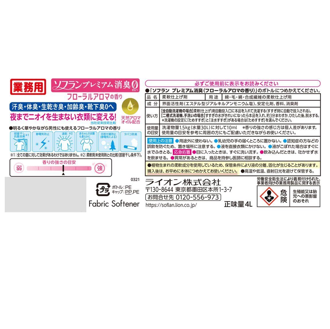 ソフラン プレミアム消臭 【業務用 大容量】 フローラルアロマの香り 4L 詰め替え 液体 柔軟剤 部屋干し 抗菌 消臭