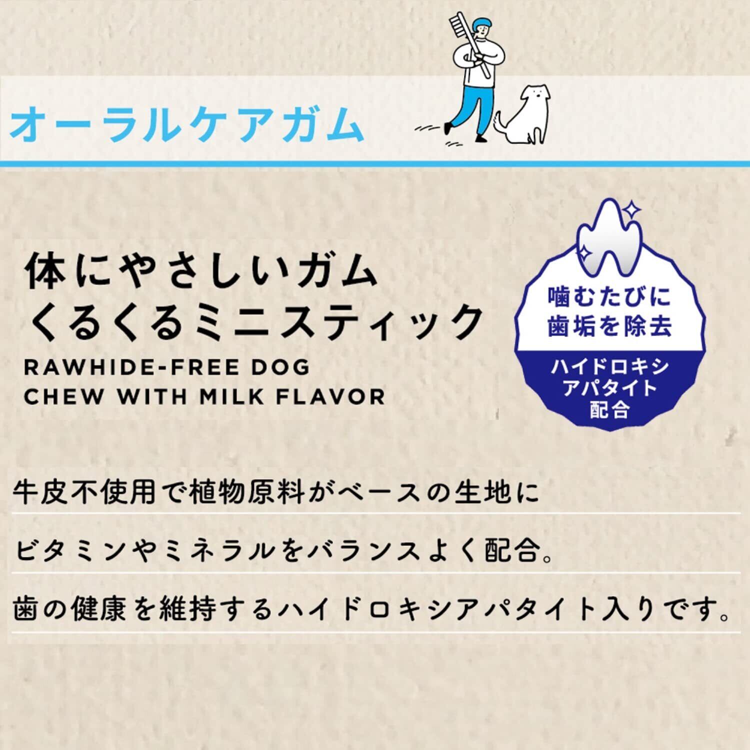・保存料、着色料、発色剤、酸化防止剤を使わずに作りました。 ・お腹にやさしい植物原料がベース。 ・ビタミンやミネラルをバランスよく配合。 ・歯の健康維持のためハイドロキシアパタイト配合。 ・ゆっくり時間をかけて噛める、骨型。超小型・小型犬に食べやすいミニサイズのスティックタイプ。