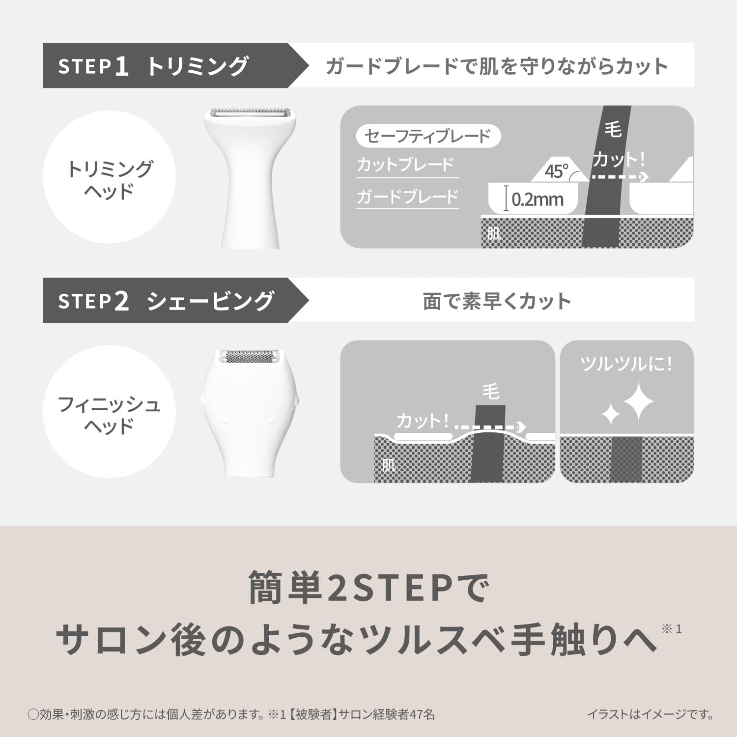 次のような部位には使用しない。 ・大陰唇以外の性器、肛門、粘膜 ・傷、湿疹、ほくろ、あざ、いぼ、吹き出物などとその周囲 ・皮膚のたるんだ部分 (肌を傷つけたり、炎症、出血などの原因) V・I・Oゾーンのお手入れのみに使用する 見えない部位へ使用するときは、鏡や見やすい姿勢でお手入れ部位を確認する (肌を傷つけたり、炎症、出血などの原因) I・Oゾーンにトリミングヘッドを使用する際はスキンガードを取りつける 使用時には以下を守る ・しっかり肌をのばす ・強く押しつけず、ゆっくり動かす ・同じところを何度もこすらない ・たたくような使いかたをしない (肌を傷つけたり、炎症、出血などの原因)