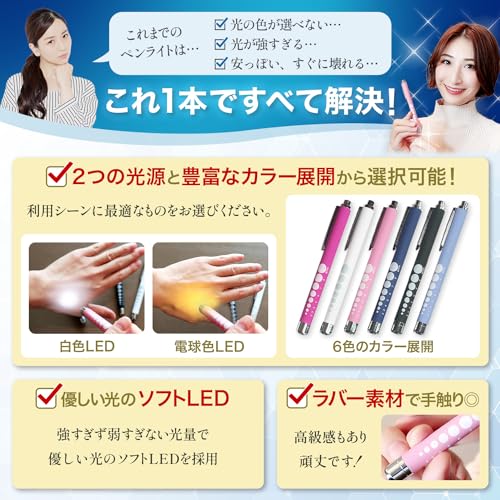 【2種類の光源と多色展開から最適なものを選択】 2色の光源を用意しております。※2色使えるわけではございません。 白い光と黄色い光からお選びいただけます。ペン本体の色も多数用意しておりますので、お好みの色をお選びください。