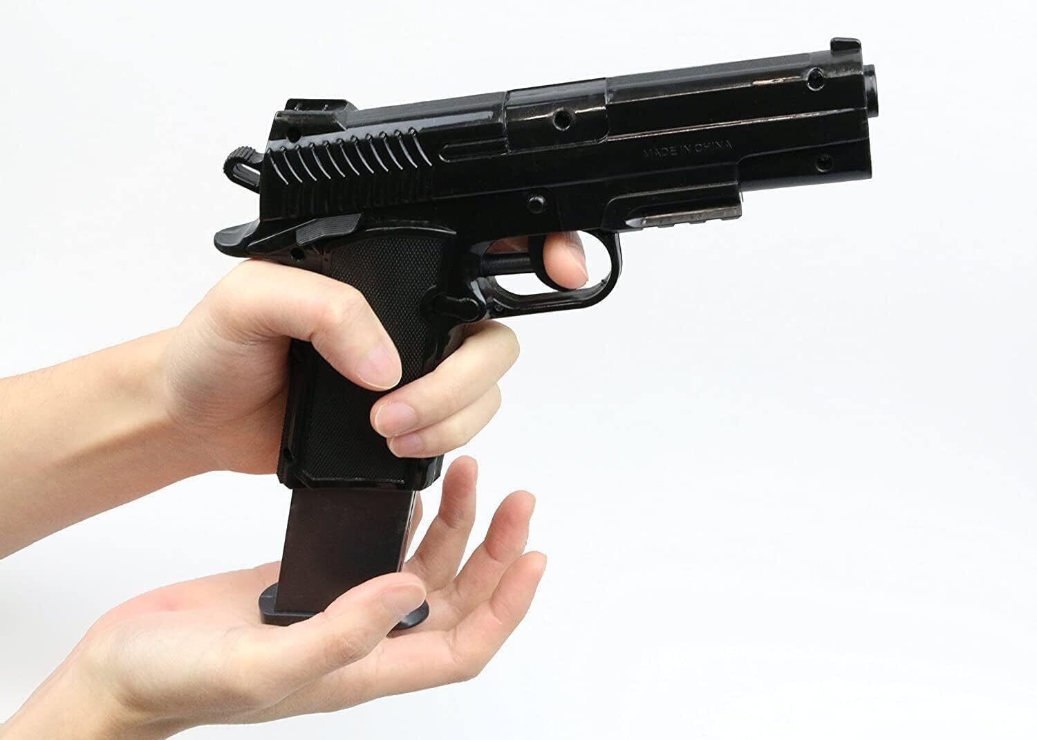 製品サイズ:(約)H20㎝×W14㎝×D4㎝ 製品重量:(約)0.098kg 材質:本体/PP、タンク/PS、キャップ/PP 原産国:中国 対象年齢:6才以上 タンク容量:(約)50cc 最大飛距離:(約)5m マガジンクリップ付。クリップで予備マガジンをポケットやベルトに取り付けることができます。 マガジン交換可能(2個付) 必ず水道水を入れてください。海水・泥水などを使うと故障の原因になります。またお風呂で使用される場合、入浴剤入りの水をご使用になると内部のスプリングを劣化させ、サビが発生する場合がございます。 小部品があります。誤飲・窒息の危険がありますので、3才未満のお子様には絶対に与えないでください。 レンタル等による貸出、オークション等による販売や中古販売、及び譲渡によって発生した故障・破損・損害・事故などにつきましては一切責任を負いかねますので予めご了承ください。
