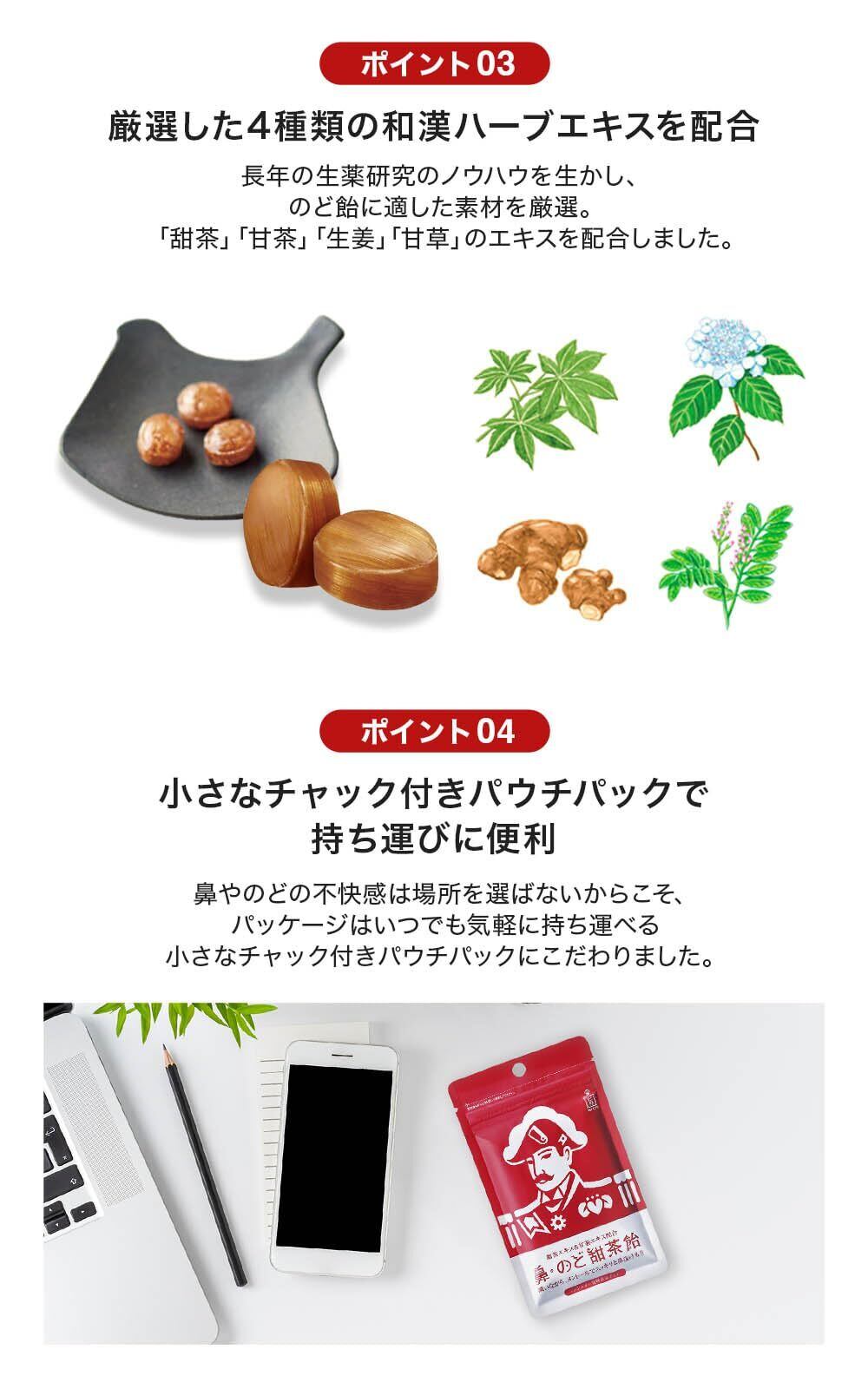 【厳選した4種類の和漢ハーブエキスを配合】長年の生薬研究のノウハウを生かし、のど飴に適した素材を厳選。「甜茶」「甘茶」「生姜」「甘草」のエキスを配合しました。