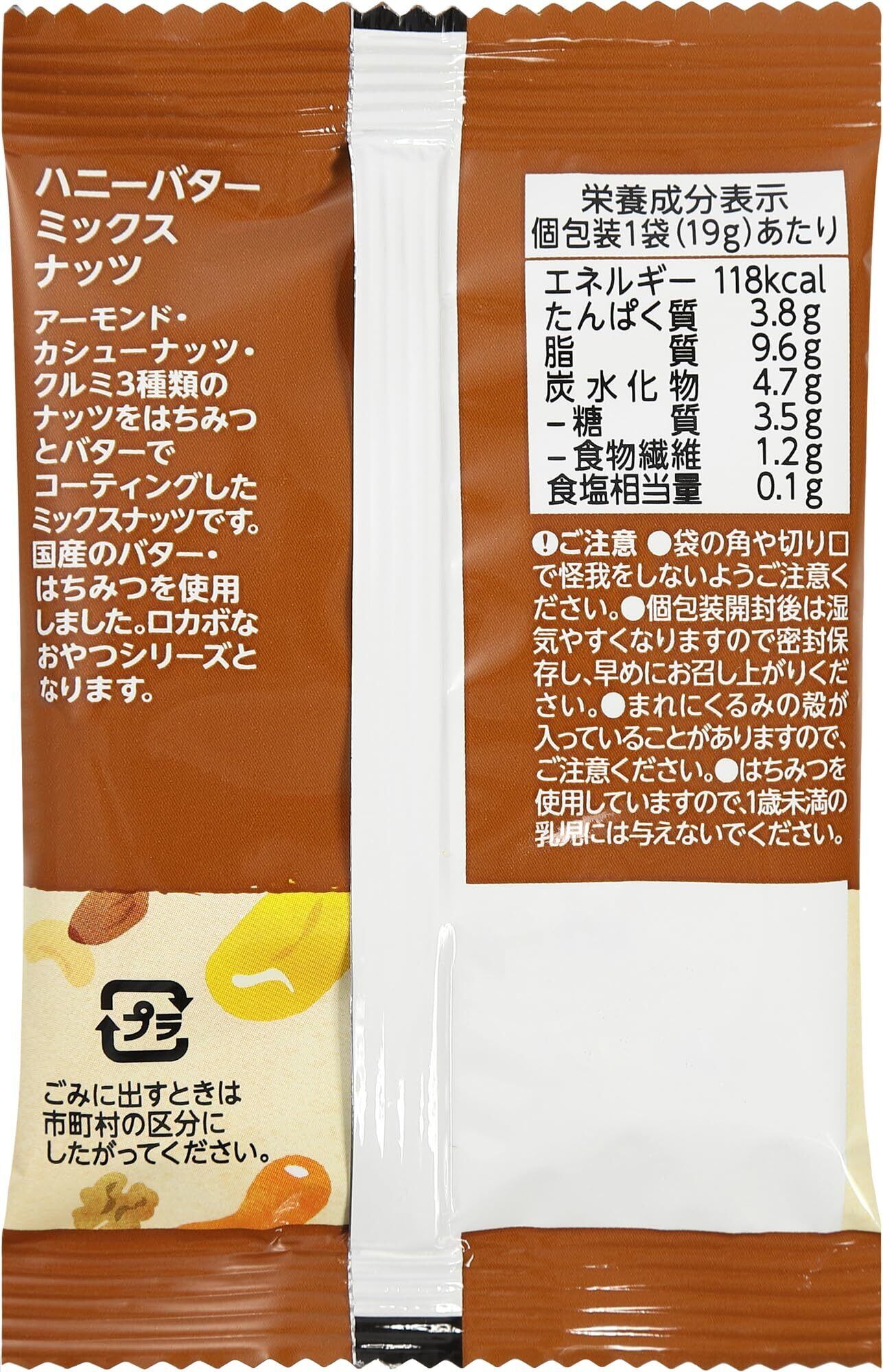 原材料:アーモンド(米国)、カシューナッツ、クルミ、砂糖、はちみつシーズニング(砂糖、酵母エキスパウダー、その他)、水あめ、バター、はちみつ、食塩/香料、加工澱粉、甘味料(ステビア)、(一部に小麦・乳成分・アーモンド・カシューナッツ・くるみを含む) 栄養成分表示:エネルギー115kcal たんぱく質3.0g 脂質9.2g 炭水化物5.7g 糖質4.4g 食物繊維1.3g 食塩相当量0.1g