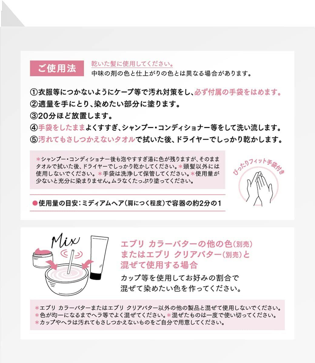 髪を傷めず、明るい髪を一度でしっかり染める高発色のカラーバター。カラーバターの他の色やクリアバターと混ぜて自分だけのオリジナルカラーも楽しめます。