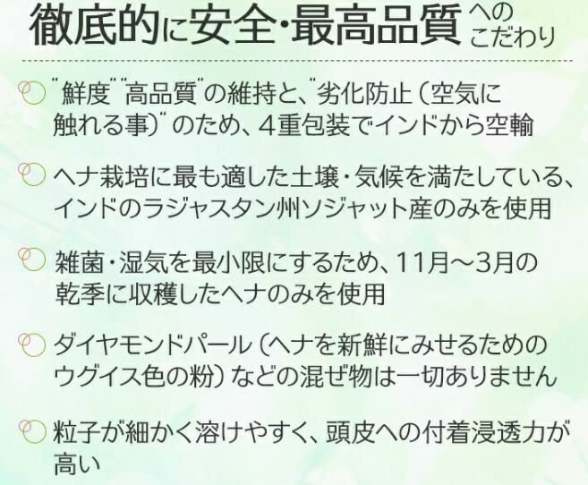 ヘナの葉に含まれるローソニアとインディゴに含まれるインジカンは含有率が最も高い最高品質AAAを採用