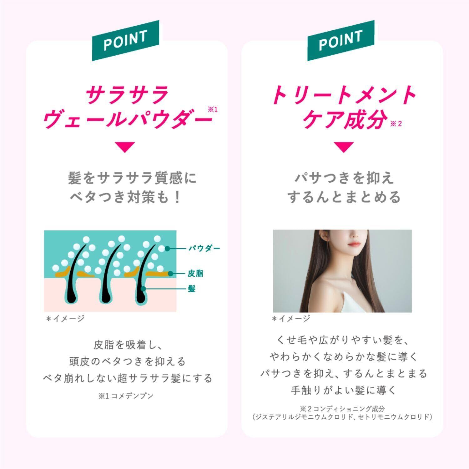 ●バティストドライシャンプーは髪を一日中「まとまりやすくサラサラ」にしてくれる新しいヘアケア。 ●スタイリング前に髪の根元や髪全体にスプレーしてブラッシングすれば、サラサラヴェールパウダー(※1)が髪をサラサラにコーティング。 ●髪のベタつきも除去し、ずっとさわっていたい髪へ。※1…コメデンプン、オクテニルコハク酸デンプンAl