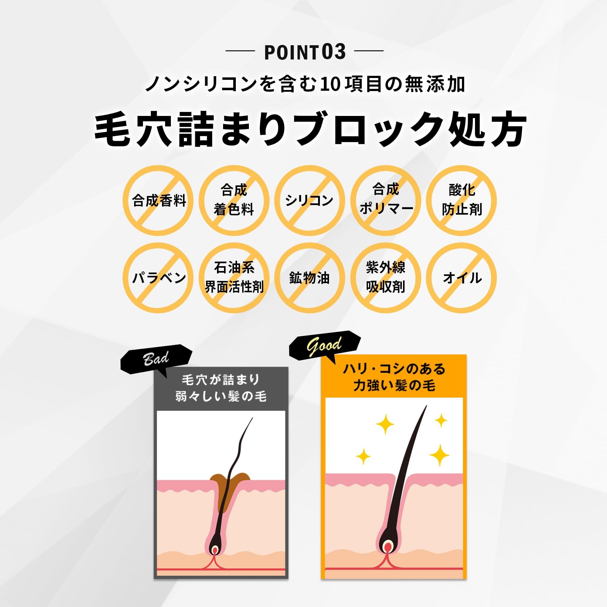【9つのピュアフリー設計】頭皮の負担となる「シリコン・パラベン・石油系界面活性剤・合成香料・合成着色料・合成ポリマー・酸化防止剤・鉱物油・紫外線吸収剤」を不使用。