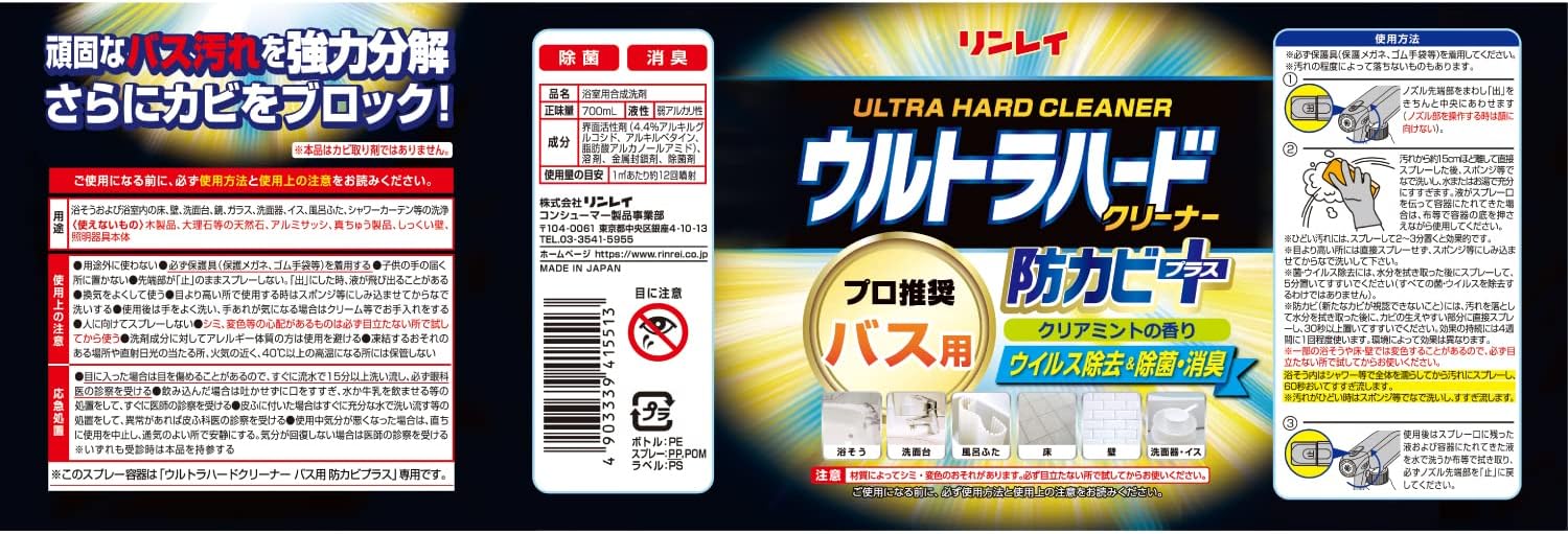 リンレイ ウルトラハードクリーナーバス用防カビプラス700ml 浴室 防カビ効果 クリアミント 掃除 強力洗剤