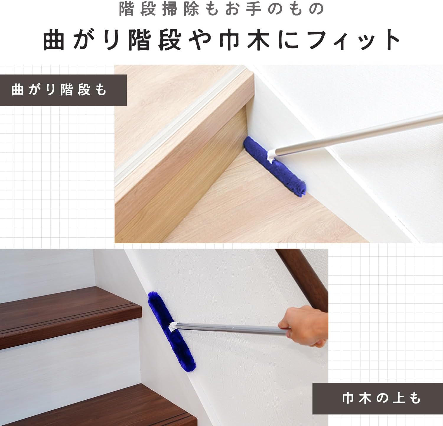 ●ケースに通すだけでいつでもモップがキレイ!ケースに溜まったホコリはまとめてポイ! ●くり返し使えるので経済的。モップ部分を取り換える必要はありません。 ●モップはケースに通すとキレイになり、ホコリは徐々にまとまって溜まります。 ●シンプルな形状のケースのため手の取りやすい場所に置きやすく、いつでもサッとお掃除できます。 ●スティック形状のモップのためフローリングや階段、隙間などのホコリ取りに便利です。またカーブしている階段の角にも届きます。 ●ラグ用ブラシ付きなので、ラグ・カーペット等に付いた糸くずやペットの毛のお掃除にも使えます。