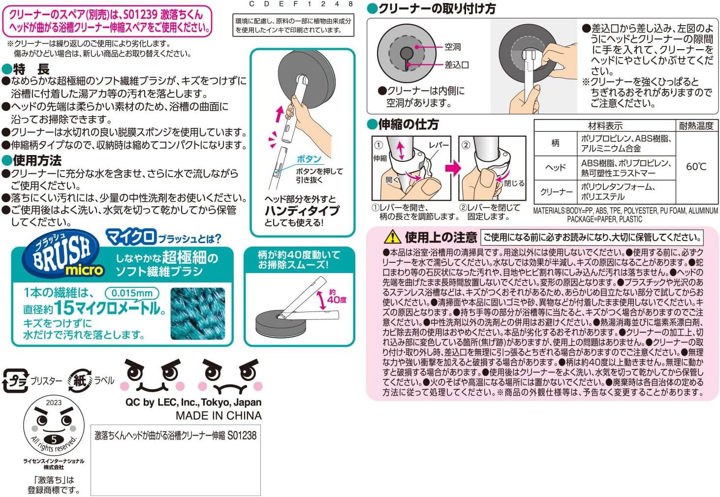 ●浴槽の湯アカを除去するブラシです。 ●なめらかな超極細のソフト繊維ブラシが、キズをつけずに浴槽に付着した湯アカ等の汚れを落とします。 ●ヘッドの先端は柔らかい素材のため、浴槽の曲面に沿ってお掃除できます。 ●クリーナーは水切れの良い脱膜スポンジを使用しています。 ●ヘッド部分を外すと、ハンディタイプとしても使えます。 ●ワンタッチレバー式で60cmから81cmまで調節可能です。 ●クリーナーは取り外して洗うことができます。 ●「レック 激落ちくん ヘッドが曲がる 浴槽クリーナー (伸縮タイプ) スペア」で取り替えることができます。