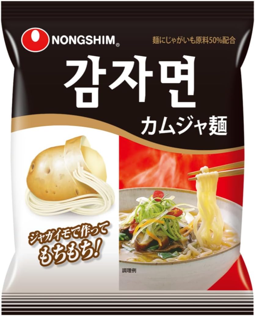 商品説明:麺にジャガイモでん粉やジャガイモ粉末を50%以上使用したもちもちとした麺の食感が絶品です。 スープは胡椒のスパイスが効いたピリ辛スープ、かやくとしてキャベツ、チンゲンサイを使用しています。 カムジャは韓国語でジャガイモの意味です。