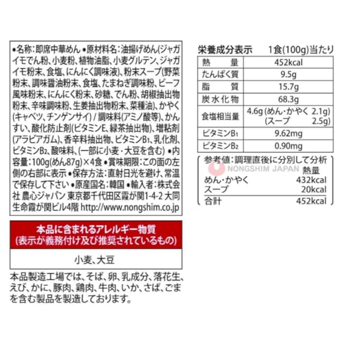 "標準栄養成分表示 [1食当たり]: ・エネルギー:452kcal ・たんぱく質:9.5g ・脂質:15.7g ・炭水化物:68.3g ・ビタミンB1:9.62mg ・ビタミンB2:0.90mg ※食塩相当量:4.6g(めん・かやく:2.1g)(スープ:2.5g)"
