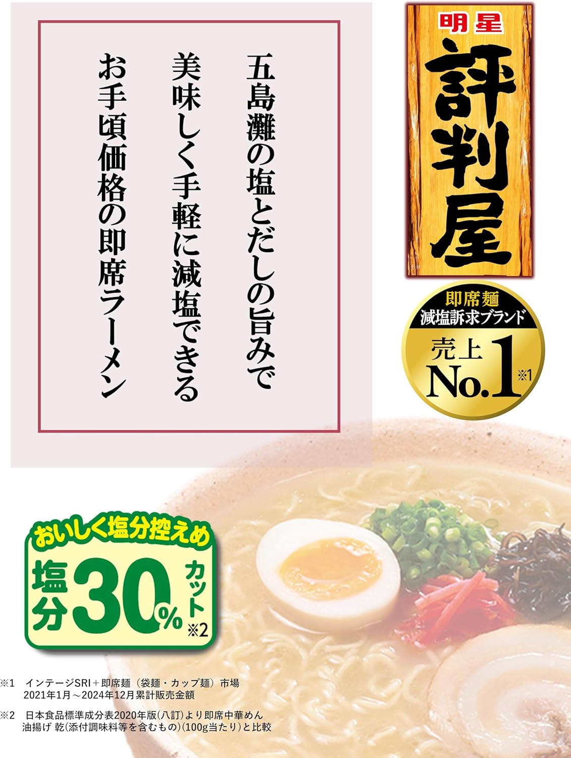 美味しく減塩できるお手軽価格の即席ラーメン。減塩訴求ブランド売上No.1(※1)!美味しく減塩できるお手軽価格の即席ラーメン「評判屋」。旨み引き立つ五島灘の塩に重ねだしで美味しさと減塩30%カット(※2)を実現してリニューアル。食べやすくつるみのあるフライ麺と、豚と魚介のだしをベースに旨みを掛け合わせた豚骨スープ。麺は食べやすくつるみのあるフライ麺。スープは旨み引き立つ五島灘の塩を配合。豚ベースに魚介のだしを重ね生姜を合わせたまろやかな味わい。※1:インテージSRI+即席めん(袋麺・カップ麺)市場 2020年1月~2023年12月累計販売金額※2:日本食品標準成分表2020年版(八訂)即席中華めん 油揚げ 乾(添付調味料等を含むもの)(100g当たり)と比較