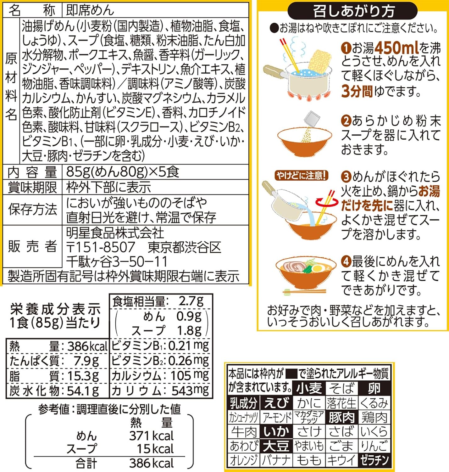 油揚げめん(小麦粉(国内製造)、植物油脂、食塩、しょうゆ)、スープ(食塩、糖類、粉末油脂、たん白加水分解物、ポークエキス、魚醤、香辛料(ガーリック、ジンジャー、ペッパー)、デキストリン、魚介エキス、植物油脂、香味調味料)/調味料(アミノ酸等)、炭酸カルシウム、かんすい、炭酸マグネシウム、カラメル色素、酸化防止剤(ビタミンE)、香料、カロチノイド色素、酸味料、甘味料(スクラロース)、ビタミンB2、ビタミンB1、(一部に卵・乳成分・小麦・えび・いか・大豆・豚肉・ゼラチンを含む)