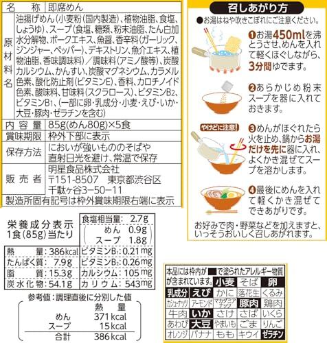 1食(85g)当たり 熱量: 386 kcal、たんぱく質: 7.9 g、脂質: 15.3 g、炭水化物: 54.1 g、食塩相当量: 2.7 g(めん: 0.9 g、スープ: 1.8 g)、ビタミンB1: 0.21 mg、ビタミンB2: 0.26 mg、カルシウム: 105 mg、カリウム: 543 mg