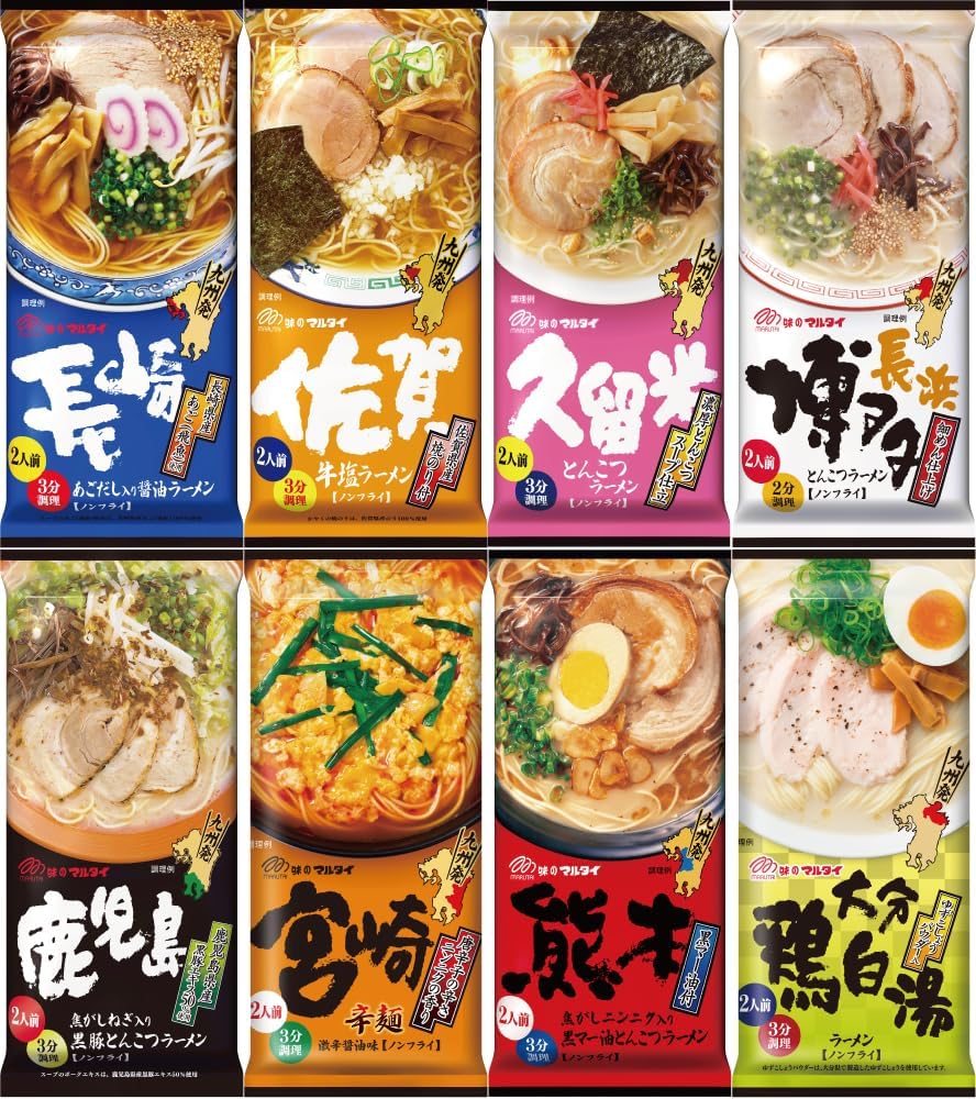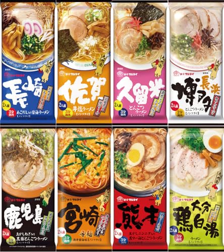 棒ラーメンのパイオニア「マルタイ」の九州ご当地ラーメン食べ比べセット(「博多とんこつラーメン」「熊本黒マー油とんこつラーメン」「鹿児島黒豚とんこつラーメン」「長崎あごだし入り醤油ラーメン」「佐賀牛塩ラーメン」「宮崎辛麺風ラーメン」「大分鶏白湯ラーメン」「久留米濃厚とんこつラーメン」 各2食入8種セット)。九州各地のご当地ラーメンや地域の特産品を活かした人気シリーズです。豚骨ラーメンを中心に、醤油ラーメンや塩ラーメン、辛麺など九州ならではの味をお楽しみください。