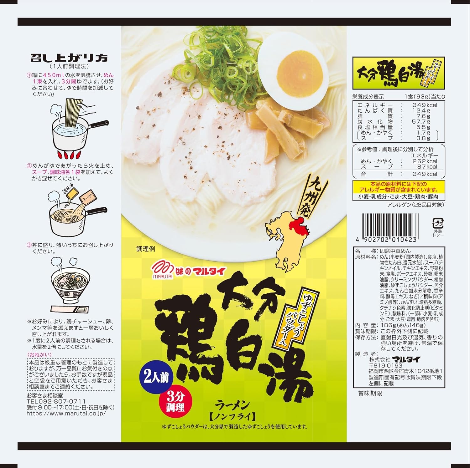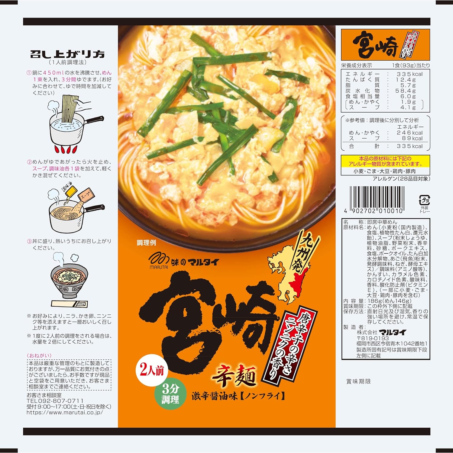 【博多】めん〔小麦粉(国内製造)、食塩、植物性たん白、還元水飴〕、スープ〔ポークエキス、ポークオイル、食塩、煎りごま、野菜粉末、糖類(砂糖、麦芽糖、ぶどう糖)、粉末油脂、粉末しょうゆ、植物油脂、たん白加水分解物、香辛料、でん粉、ねぎ、すりごま、ホタテエキス、酵母エキス〕/調味料(アミノ酸等)、かんすい、pH調整剤、クチナシ色素、カラメル色素、香料、酸化防止剤(ビタミンE)、(一部に小麦・乳成分・ごま・大豆・鶏肉・豚肉・ゼラチンを含む) 【熊本】めん〔小麦粉(国内製造)、食塩、植物性たん白、還元水飴〕、スープ〔ポークエキス、マー油、食塩、粉末しょうゆ、野菜粉末、粉末油脂、糖類(ぶどう糖、砂糖)、たん白加水分解物、でん粉、ローストガーリック、香辛料、酵母エキス、魚介エキス、ごま油〕/調味料(アミノ酸等)、かんすい、クチナシ色素、pH調整剤、カラメル色素、酸化防止剤(ビタミンE)、香料、香辛料抽出物、(一部に小麦・乳成分・えび・ごま・大豆・鶏肉・豚肉・ゼラチンを含む) 【鹿児島】めん〔小麦粉(国内製造)、食塩、植物性たん白、還元水飴〕、スープ〔ポークエキス、ポークオイル、食塩、野菜粉末、粉末しょうゆ、粉末油脂、糖類(ぶどう糖、麦芽糖、砂糖)、チキンエキス、植物油脂、焦がしねぎ、でん粉、香辛料、たん白加水分解物、チキンオイル、ホタテエキス、酵母エキス〕/調味料(アミノ酸等)、かんすい、クチナシ色素、カラメル色素、酸味料、香料、酸化防止剤(ビタミンE)、(一部に小麦・乳成分・ごま・大豆・鶏肉・豚肉を含む) 【長崎】めん〔小麦粉(国内製造)、食塩、植物性たん白、還元水飴〕、スープ〔ポークオイル、粉末しょうゆ、食塩、植物油脂、あご(飛魚)粉末、糖類(砂糖、ぶどう糖)、煎りごま、粉末魚醤、野菜粉末、チキンエキス、でん粉、煮干エキス、昆布エキス、ポークエキス、ホタテエキス、たん白加水分解物、香辛料、酵母エキス、カツオ節粉末、マグロエキス、ねぎ〕/調味料(アミノ酸等)、かんすい、カラメル色素、クチナシ色素、酸化防止剤(ビタミンE)、香料、(一部に小麦・乳成分・ごま・大豆・鶏肉・豚肉・ゼラチンを含む) 【佐賀】めん〔小麦粉(国内製造)、食塩、植物性たん白、還元水飴〕、スープ〔ビーフオイル、ビーフエキス、食塩、野菜粉末、糖類(砂糖、ぶどう糖、麦芽糖)、酵母エキス、あご(飛魚)粉末、ごま油、たん白加水分解物、香辛料〕、かやく(のり)/調味料(アミノ酸等)、かんすい、クチナシ色素、pH調整剤、甘味料(カンゾウ)、酸化防止剤(ビタミンE)、(一部に小麦・乳成分・牛肉・ごま・大豆・鶏肉・豚肉を含む) 【宮崎】めん〔小麦粉(国内製造)、食塩、植物性たん白、還元水飴〕、スープ〔粉末しょうゆ、植物油脂、野菜粉末、香辛料、砂糖、ポークエキス、食塩、ポークオイル、たん白加水分解物、あご(飛魚)粉末、発酵調味料、ねぎ、酵母エキス〕/調味料(アミノ酸等)、かんすい、カラメル色素、カロチノイド色素、酸味料、香料、酸化防止剤(ビタミンE)、(一部に小麦・ごま・大豆・鶏肉・豚肉を含む) 【大分】めん〔小麦粉(国内製造)、食塩、植物性たん白、還元水飴〕、スープ(チキンオイル、チキンエキス、野菜粉末、食塩、ポークエキス、砂糖、粉末油脂、クリーミングパウダー、植物油脂、ゆずこしょうパウダー、魚介エキス、たん白加水分解物、香辛料、酵母エキス、ねぎ)/調味料(アミノ酸等)、かんすい、増粘多糖類、クチナシ色素、酸化防止剤(ビタミンE)、酸味料、(一部に小麦・乳成分・ごま・大豆・鶏肉・豚肉を含む)【久留米】めん〔小麦粉(国内製造)、食塩、植物性たん白、還元水飴〕、スープ〔ポークエキス、ポークオイル、食塩、糖類(砂糖、ぶどう糖)、粉末油脂、野菜粉末、粉末しょうゆ、植物油脂、煎りごま、たん白加水分解物、すりごま、ねぎ、香辛料、酵母エキス、チキンオイル〕/調味料(アミノ酸等)、かんすい、クチナシ色素、pH調整剤、カラメル色素、香料、酸化防止剤(ビタミンE)、(一部に小麦・乳成分・ごま・大豆・鶏肉・豚肉・ゼラチンを含む)