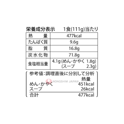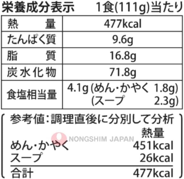 標準栄養成分表示 [1食当たり]: ・エネルギー:477kcal ・たんぱく質:9.6g ・脂質:16.8g ・炭水化物:71.8g ※食塩相当量:4.1g(めん・かやく:1.8g)(スープ:2.3g)