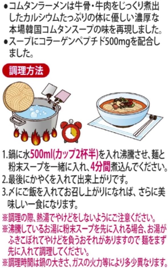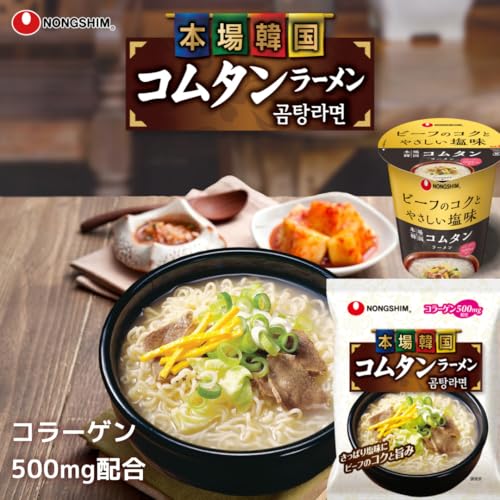 商品説明:牛骨・牛肉をじっくり煮出したカルシウムたっぷりの体に優しい濃厚な本場韓国コムタンスープの味を再現、麺はコシがあり、しこしことした細麺です。 フィッシュコラーゲンペプチド500mg配合(赤魚鯛の皮、鱗から製造)。 辛くないので老若男女誰もが楽しむことが出来ます。
