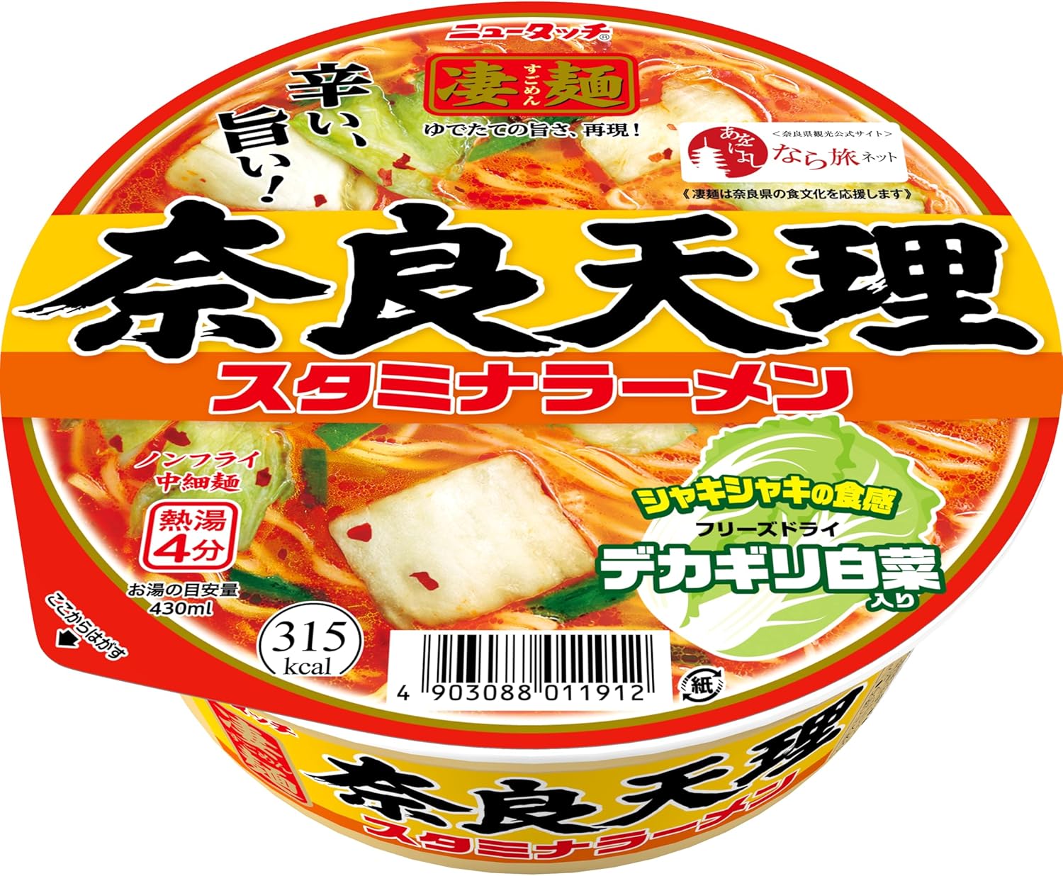 奈良県天理市発祥のご当地ラーメンをカップ麺で本格再現しました。ポークベースに、ニンニクと豆板醤を効かせた、刺激的な味わいの醤油スープです。 麺はつるつる、モチモチとした生麺のような食感が自慢のノンフライ麺で、中細の麺と辛口の醤油スープとの相性は抜群です。 具材には大きめカットの白菜とニラをふんだんに使用した、一度食べたら癖になる味わいの一品です。