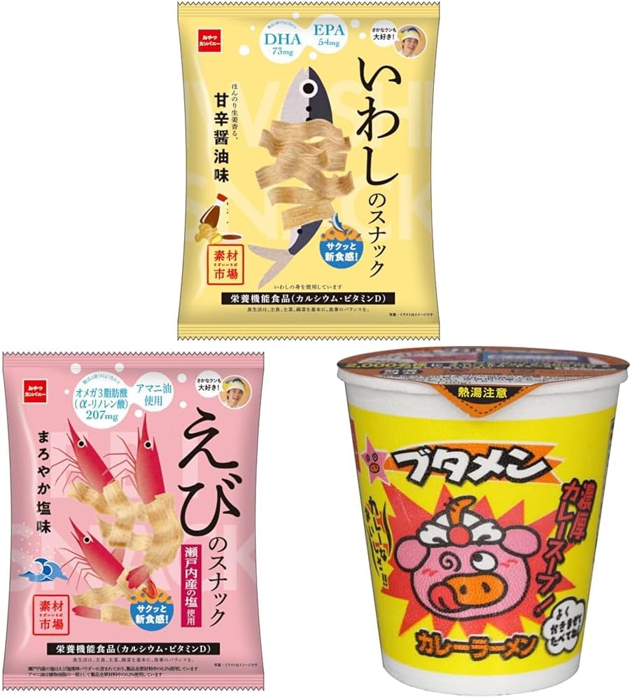 【公式】素材市場 いわしのスナック ほんのり生姜香る甘辛醤油味 61g×12袋 | 栄養機能食品 カルシウム ビタミンD DHA EPA イワシチップス お魚のスナック ローリングストック おやつカンパニー おやつのチカラ いわしのすり身を高配合した、カリッサクッとした食感のスナック菓子。生姜の風味を効かせた甘辛しょうゆ味に仕上げました。オメガ3(オメガスリー)脂肪酸に分類されるDHA、EPAや、カルシウムが含まれています。健康を意識した身体に優しいスナックです。※栄養機能食品(カルシウム) 【公式】 素材市場 えびのスナック まろやか塩味 61g×12袋 | 栄養機能食品 カルシウム ビタミンD オメガ3脂肪酸 アマニ油 えびせん ローリングストック おやつカンパニー おやつのチカラ 小麦粉(国内製造)、植物油脂、小麦グルテン、えび粉、えび塩風味パウダー、食塩、ローストしょうゆパウダー/加工デンプン、炭酸Ca、調味料(アミノ酸等)、乳化剤、香料、酸化防止剤(ビタミンE、チャ抽出物)、カラメル色素、ビタミンD、(一部にえび・小麦・大豆・鶏肉・豚肉を含む)※本製品製造施設では、えび、かに、そば、卵、乳、落花生を含む製品を製造しています。 【公式】ブタメン カレーラーメン 35g×15個 | 夜食 カップラーメン ミニ カップ麺 小腹 インスタント アウトドアにも ローリングストック おやつカンパニー 大人買い 定番のミニカップラーメン、ブタメンカレー味。ブタメンは1993年に初めて発売されました。濃厚なカレースープをお楽しみください。少し小腹がすいたときに、おやつや夜食に、ランチのおともに、ぴったりなミニサイズ。お子様からおとなの方まで幅広く召し上がっていただけます。