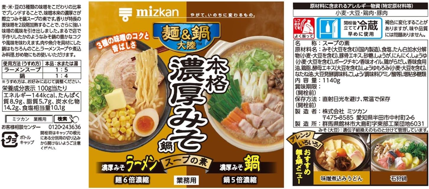 【セット買い】ミツカン 麺&鍋大陸 濃厚鶏白湯スープの素 1110g 鍋の素 ラーメンスープ + ミツカン 麺&鍋大陸 本格濃厚みそ鍋スープの素 鍋の素 ラーメンスープ 1140g + ミツカン 麺&