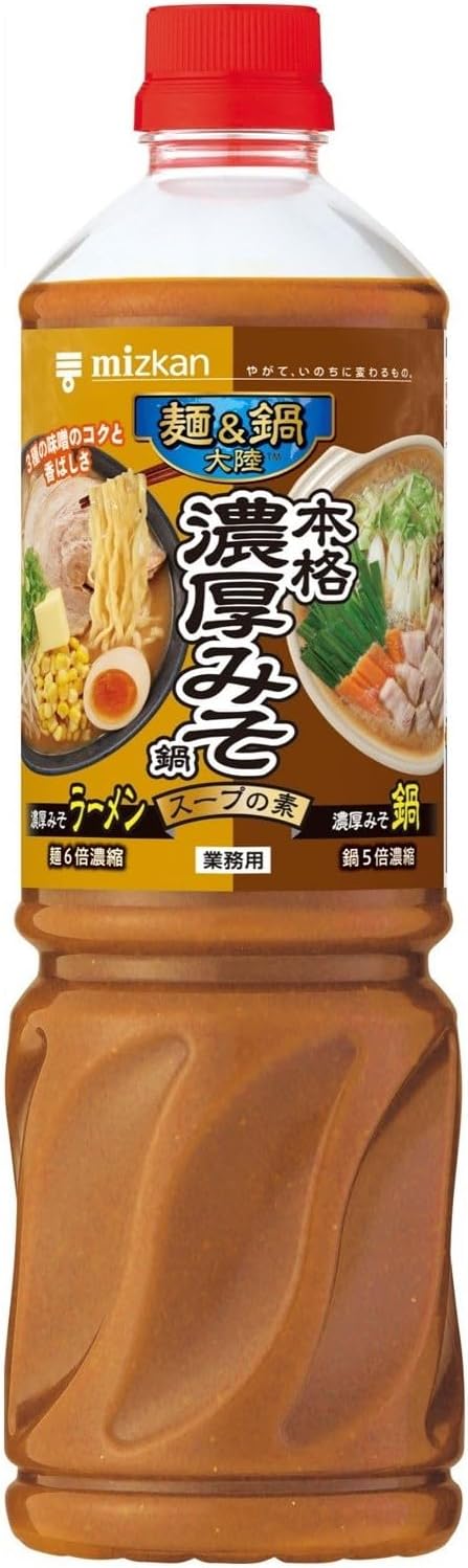 ミツカン 麺&鍋大陸 濃厚鶏白湯スープの素 1110g 鍋の素 ラーメンスープ 商品紹介 鶏のがらをじっくり煮込んだ濃厚な旨みの白湯スープに『鶏油(チーユ)』を加え更に鶏の旨味と風味を豊かに仕上げました。 ラーメン(らーめん)では鶏白湯ラーメン、鍋では本格的な博多水炊きを簡単にお作り頂けます。 鍋として召し上がる際、そのまま食しても美味しく、またぽん酢につけて食べると更に美味しく頂ける鍋の素(鍋つゆ、鍋スープ、ラーメンスープ)です。 鍋使用時11倍、麺使用時10倍の濃縮タイプです。 本製品1本で鍋41人前、ラーメン37人前作れます。(1人前300gとして) ※本製品は、業務用製品ですが、一般消費者の方にもお使い頂けます。 原材料・成分 チキンパイタン(国内製造)、食塩、チキンエキス(卵・乳成分を含む)、鶏脂、なたね油、砂糖、アミノ酸液(大豆を含む)、乳たん白、おろしにんにく、醸造酢/調味料(アミノ酸等)、増粘剤(キサンタンガム)、乳化剤(大豆由来) ミツカン 麺&鍋大陸 本格濃厚みそ鍋スープの素 鍋の素 ラーメンスープ 1140g 麦・米・豆の3種類の味噌をこだわりの比率でブレンドすることで、味噌本来の濃厚さが際立つみそ鍋スープの素(鍋の素、鍋つゆ、鍋スープ、なべつゆ)です。香りが特長の麦味噌を2段階加熱することで、さらに強い味噌の風味を引き出しました。まるで店で手作りしたかのようなみそ鍋の豊かなコクや風味を味わえます。肉や魚介を具材にした鍋はもちろんのこと、ラーメンスープや煮込み料理、炒め物にもお使いいただけます。 ミツカン 麺&鍋大陸 やみつき豚骨みそ鍋スープの素 鍋の素 1100g じっくり煮込んだ豚骨と鶏ガラの白湯スープに、米・豆の2種類の味噌をブレンドしました。ごま油と鶏脂で炒めたにんにくのパンチが効いた、コクのある味わいがやみつきになる豚骨みそ鍋スープの素(鍋の素、鍋つゆ、鍋スープ、なべつゆ)です。肉や魚介を具材にした鍋はもちろんのこと、ラーメンスープや煮込み料理、炒め物にもお使いいただけます。