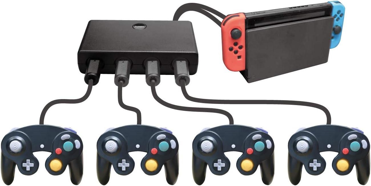 GCコントローラが最大4台接続できる! 連射機能も付いたコントローラアダプタです。 特徴1:挿すだけで簡単認識。GCコントローラが最大4台接続可能です。 ・みんなでワイワイ楽しめます。 ・本製品を2台接続すれば最大8人で楽しむことも可能です。(対応ソフト要確認) 特徴2:各ボタンへ連射設定が可能(6回/秒)。対戦時に役立ちます。 ・連射機能は(A.B.X.Y.Zボタン)に設定できます。 特徴3:SWITCHのほか、PCやWiiUでも使えます。 特徴4:USBコネクタの抜き差しでコントローラの振動の有り無しが選択できます。 ・振動が必要ない場合は、振動用のUSBコネクタを外して切り替え可能です。 型番 : SWF2165