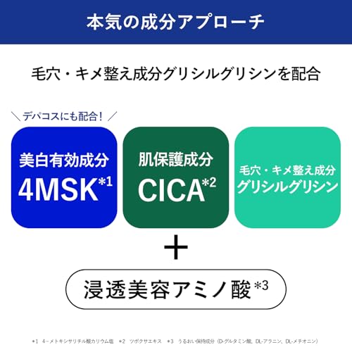 4-メトキシサリチル酸カリウム塩*,D-グルタミン酸,DL-アラニン,DL-メチオニン,ツボクサエキス,グリシルグリシン,加水分解コンキオリン液,アセチル化ヒアルロン酸ナトリウム,ヒアルロン酸ナトリウム(2),水溶性コラーゲン(F),濃グリセリン,精製水,1,3-ブチレングリコール,ジプロピレングリコール,α-オレフィンオリゴマー,トリ2-エチルヘキサン酸グリセリル,イソステアリン酸ポリオキシエチレングリセリル,ワセリン,マイクロクリスタリンワックス,デカメチルテトラシロキサン,メチルポリシロキサン,マルチトール液,リンゴ酸ジイソステアリル,モノステアリン酸ポリオキシエチレングリセリル,ベヘニルアルコール,無水ケイ酸,ステアリン酸,イソステアリン酸,ベヘニン酸,バチルアルコール,サクシノグルカン,水酸化カリウム,ポリオキシエチレン(17)ポリオキシプロピレン(4)ジメチルエーテル,カルボキシビニルポリマー,キサンタンガム,エデト酸二ナトリウム,マカデミアナッツ油脂肪酸フィトステリル,ポリオキシエチレン(14)ポリオキシプロピレン(7)ジメチルエーテル,メタリン酸ナトリウム,2-O-エチル-L-アスコルビン酸,ピロ亜硫酸ナトリウム,フェノキシエタノール,パラオキシ安息香酸エステル,香料 *は「有効成分」無表示は「その他の成分」