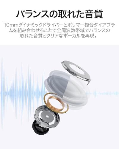 【高音質 バランスの取れた音質とクリアなボーカルを再現】:10mmダイナミックドライバーとポリマー複合ダイアフラムを組み合わせることで全周波数帯域でバランスの取れた音質とクリアなボーカルを再現。専用アプリのカスタムイコライザーは低音から高音まで10バンドもの音域で調整でき、お好みのリスニングスタイルを作成しプレイすることが可能です。