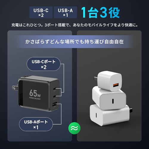 【3台同時充電に対応 MAX65WのPD急速充電】お使いのスマートフォンやタブレットを驚くほど短時間でフル充電。2つのType-Cポートから各65W/Type-Aポートから30Wのパワーデリバリー(PD)出力で、充電時間を大幅に短縮します。3ポート同時充電ではType-CポートからMAX45Wの出力が可能。