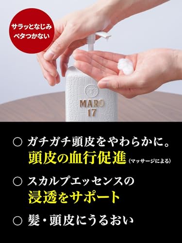 その頭皮に逆転劇を。MARO17独自処方のペプチド(*1)配合、男のためのプレミアムなスカルプコンディショナー。頭皮直づけ&マッサージで頭皮をほぐして柔らか地肌に。 ●地肌に直塗りしてなじませ、軽くマッサージすることで血行を促進 ●頭皮を健やかに整え、スカルプ エッセンスの浸透を高めます ●植物幹細胞(*2)由来成分配合 ●ノンシリコン *1:独自処方ペプチド(アセチルテトラペプチド-3、トリフルオロアセチルトリペプチド-2(すべて保湿成分)) *2:リンゴ果実培養細胞エキス(保湿) ※コラーゲン配合(保湿) ※パッケージデザイン等は予告なく変更されることがあります 「育毛・養毛用コンディショナー」売れ筋ランキング No.1 (2019年6月2日調べ)