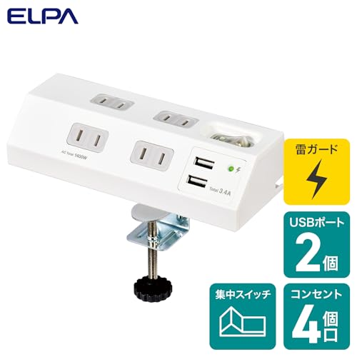 エルパ(ELPA) デスクUSBタップ クランプ固定 コンセント 4口 USB 2口 2.4A 集中スイッチ 雷ガード 電源タップ 延長コード 2m ホワイト WLS-DS4232SUA(W)