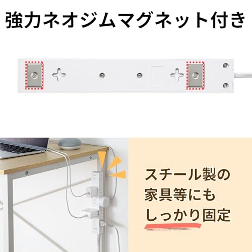 サンワサプライ(Sanwa Supply) 電源タップ 10個口・2P (2m) たくさん挿せるレイアウト 強力ネオジムマグネット ほこりシャッター スイングプラグ ホワイト TAP-2210-2W