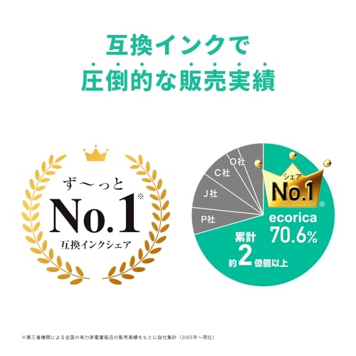 エコリカはエコマーク認定商品。第三者評価により純正品と同等の印刷枚数を保証されております。品質・安全性をクリアした製品です。 選ばれ続けてず~っとシェアNo.1 ※第三者機関による全国の有力家電量販店の販売実績をもとに自社集計(2005年~現在)