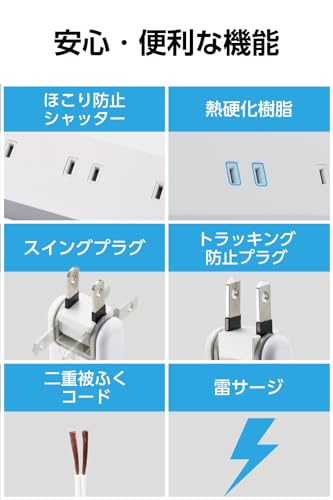 【 仕様 】 ■本体差込口形状:2ピン ■本体差込口個数:10個口(上面5個口、側面5個口) ■プラグ仕様:2ピン ■3ピン→2ピン変換アダプタ付属:× ■コード長:1m ■定格:15A、125V、1500Wまで ■スイッチ:○(一括スイッチ) ■雷ガード:○ ■ほこりシャッター:○ ■絶縁キャップ付きプラグ:○ ■差込口キャップ付属:× ■通電表示ランプ:○(一括スイッチ部) ■二重被ふく:○ ■抜け止め機能:× ■スイングプラグ:○ ■マグネット:○ ■固定方法:マグネットによる吸着が可能 ■ノイズフィルター:× ■モジュラジャック付:× ■カラー:ホワイト ■材質:本体:ABS樹脂、プラグ:PVC、差込口:ユリア樹脂 ■外形寸法:幅295mm×奥行43mm×高さ32mm ※コード部分及びプラグ部分を除く ■質量:約319g ■使用可能地域:日本国内専用 ■電気用品安全法:◇PSE適合 ■保証期間:1年間 ■その他:差込み口を上面と側面に配置したコンパクト設計 【 説明 】 ■上面と側面にそれぞれ5個口ずつ、計10個口の2ピン式差込口を搭載したタップです。 ■差込口を2面に分けて配置することで、10個口でありながらコンパクトになっています。 ■接続機器をまとめてON/OFFし、待機電力を節約できる一括スイッチが付いています。スイッチはON時、オレンジ色に発光し、ひと目でON/OFFの状態が確認できます。 ■底面には超強力なネオジム磁石を配し、スチール製の家具や事務機などに吸着させて利用できます。 ■接続したプラグが隣の差込口に干渉しにくいよう、差込口の中心間が最短40mmと余裕のある設計になっています。また、上面と側面それぞれの端にある1個口は57mmとさらに離した配置にしているので、大きなACアダプターなどでも利用しやすくなっています。 ■差込口にプラグが差し込まれていない場合にホコリの侵入を防止する「ホコリ防止シャッター」を装備しています。 ■差込口には耐熱性に優れた熱硬化性樹脂を使用しており、万が一の発熱の際にも融解しにくく、電気火災の防止に有効です。 ■誘導雷による最大12500Vまでの雷サージを吸収する素子(バリスタ)を搭載し、接続機器を保護します。 ■※最大サージ電圧12500VはJEC210/212規格に基づく数値です。受けた電圧や回数により性能は劣化します。 ■トラッキング現象による火災の防止に有効な絶縁スリーブを装備した2ピン式プラグです。 ■狭い場所でも配線しやすい180度スイングプラグを採用しています。 ■電源コードには一般社団法人日本配線システム工業会規格(JWDS0010)に適合した二重被ふくコードを採用し、断線や被ふく破れによる感電・火災の防止に有効です。 ■自社環境認定基準を1つ以上満たし、『THINK ECOLOGY』マークを表示した製品です。 ■環境保全に取り組み、製品の包装容器におけるプラスチック重量を、社内基準製品より20%以上削減した製品です。 ■環境保全に取り組み、製品の包装容器が紙・ダンボール・ポリ袋のみで構成されている製品です。 【商品に関するお問い合わせ】 エレコム総合インフォメーションセンター TEL. 0570-084-465 FAX. 0570-050-012 受付時間 / 10:00~19:00 年中無休