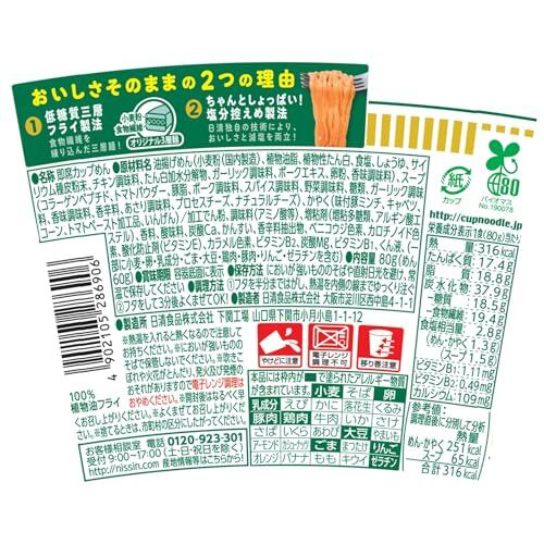 油揚げめん(小麦粉(国内製造)、植物油脂、植物性たん白、食塩、しょうゆ、サイリウム種皮粉末、チキン調味料、たん白加水分解物、ガーリック調味料、ポークエキス、卵粉、香味調味料)、スープ(コラーゲンペプチド、トマトパウダー、豚脂、ポーク調味料、スパイス調味料、野菜調味料、糖類、ガーリック調味料、香味調味料、香辛料、あさり調味料、プロセスチーズ、ナチュラルチーズ)、かやく(味付豚ミンチ、キャベツ、コーン、トマトペースト加工品、いんげん)/加工でん粉、調味料(アミノ酸等)、増粘剤(増粘多糖類、アルギン酸エステル)、香料、酸味料、炭酸Ca、かんすい、香辛料抽出物、ベニコウジ色素、カロチノイド色素、酸化防止剤(ビタミンE)、カラメル色素、ビタミンB2、炭酸Mg、ビタミンB1、くん液、(一部に小麦・卵・乳成分・ごま・大豆・鶏肉・豚肉・りんご・ゼラチンを含む)