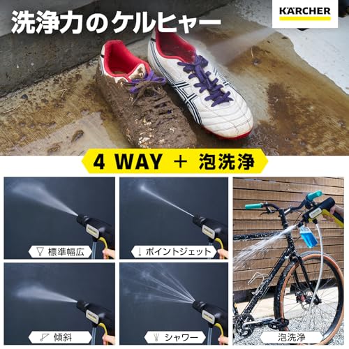 シュッと取り出せ、思い立ったらすぐ洗浄できる利便性と、移動場所でも洗浄できる手軽さに、コンパクトに折りたため場所を取らない携帯性を備えたモバイル高圧洗浄機です。バッテリー内蔵式で、付属の自吸用ホースまたはペットボトルを使用することで、電源はもちろん水源も気にせずどこでも高圧洗浄できます。<携帯性に優れた手のひらサイズ>折りたたむと手のひらサイズに収納可能。持ち運びに便利で外出先で大活躍。<4 in 1 ノズルと洗浄剤ノズル付>付属アクセサリーの4 in 1ノズルで使用場所や用途によって最適な水流パターンを選択可能。洗浄剤ノズル付きで泡洗浄にも対応しています。<簡単・手軽なコードレス洗浄>充電式バッテリーと自吸用ホース・ペットボトルアダプター付属で、どこでも持ち運んで洗浄可能です。また、USBで充電可能なので、いろんな場所で充電できます。※ 本製品は接続口の形状が異なるため、水道ホースやホースリールを接続して使用することはできません。<スポーツやアウトドア、外出時での汚れに大活躍>今までは諦め放っておいた泥汚れに、いつでもどこでも、シュッと取り出し、サッと拡げてみるみる汚れが落ちる、驚きと爽快感。今までの放っておいた泥汚れの当たり前が、これからはきれいが当たり前に。<付属品 >4 in 1ノズル、5m自吸用ホース、ホースクリップ、ペットボトルホルダー、洗浄剤ノズル、充電用USBケーブル(USB充電器なし)、取扱説明書