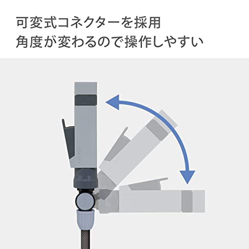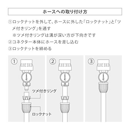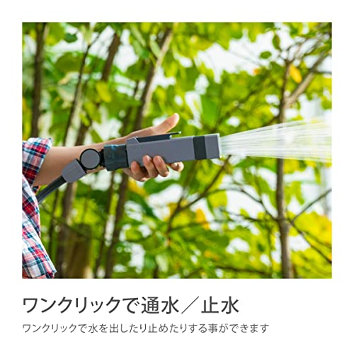 通水/止水の切り替えが手元で操作可能です。 スティックタイプの散水ノズルです。 ノズルの根元は可変式です。 水形がキリ・シャワー・ストレート・ジョロの4種類に切り替えができます。 細ホース(内径7.5-9mm/外径13.5mm)に対応しています。