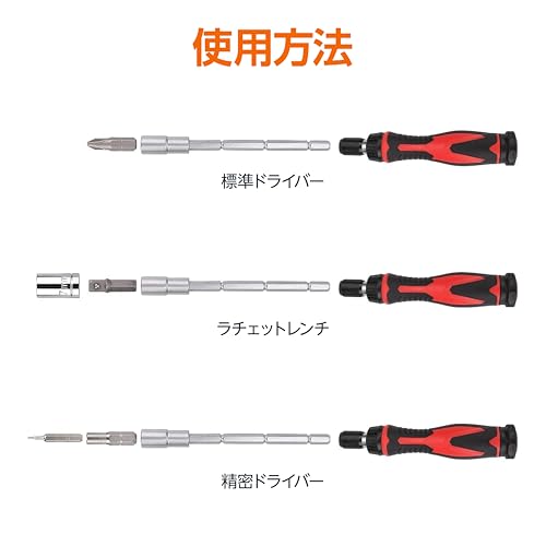 ドライバーとラチェットの3つの機能 : 固定、時計回り、反時計回りへの回転・ドライバーの基部が自由に回転し、安定して圧力を加えながらハンドルを回すことが可能