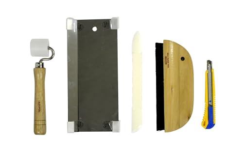 【セット内容】1.おさえハケ(180mm) 2.ヘラ(200mm) 3.おさえローラー(32mm) 4.ステンレスカット定規(220mm) 5.カッターナイフ