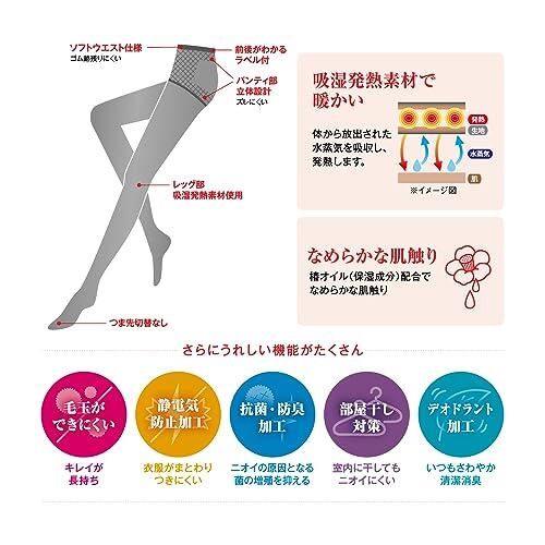【プレミアムなはき心地、つつみこみ暖かさ】110デニールタイツです。柔らかい生地でなめらかな肌触りと、フィット感アップで快適なはき心地を実現しました。 レッグ部には吸湿性に優れた素材を使用し、体から放出された水蒸気を吸収し発熱します。 ・吸湿発熱素材使用 ・パンティ部立体設計 ・ゴム跡が残りにくいソフトウエスト ・毛玉ができにくい ・抗菌防臭加工 ・部屋干し対策 ・帯電防止加工 ・椿オイル配合柔軟 ・デオドラント加工 ・つま先切替なし ・2足組