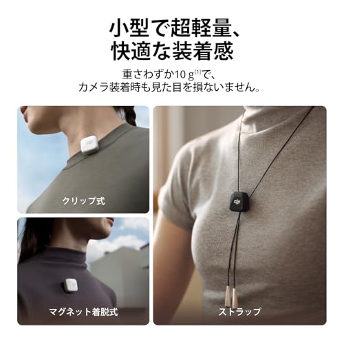 【小さくてもパワフル】 - DJI Mic Miniトランスミッターは、小型で重さわずか10 gの超軽量です[1]。快適に装着でき、目立たないデザインで、マイクを付けていても外観を損ねません。