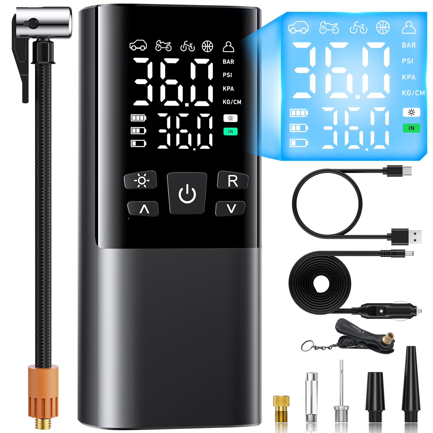 【高精度のLCDデジタル表示&6000mAh大容量電池】⛽️高精度のLCDデジタル表示を搭載しており、現在の圧力をリアルタイムで正確に確認できます。ディスプレイは視認性が高く、昼夜を問わず見やすい設計になっており、夜間でも安心して使用できます。電動空気入れは6000mAhの大容量バッテリーを内蔵しており、2.5時間の充電で何度も使用できる。自転車用タイヤに35回、バイク用タイヤに20回、自動車用タイヤに12回、ボール用タイヤに72回。⚽️さらに、途中でバッテリー切れを心配することなく、車のシガーソケットを使って持続的な使用を可能にします。