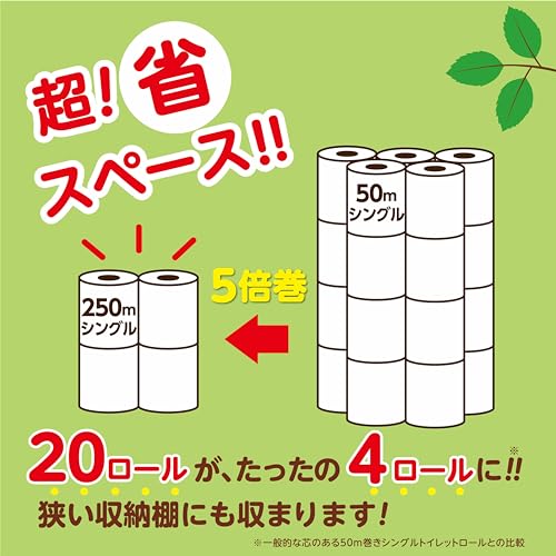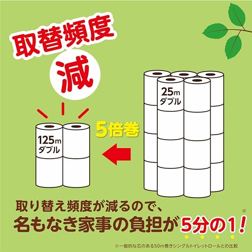 取り替え頻度と保管スペースが5分の1に。芯もトイレットペーパーで出来ているので最後まで使いきれるエコなトイレットペーパー。